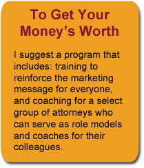 Training teaches concepts to groups. It can effectively communicate firm branding concepts, cross-selling information and team tools. It provides a useful forum for introducing marketing and business development techniques and offers a setting in which to practice marketing activities using role play and group feedback.
